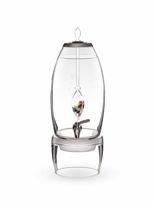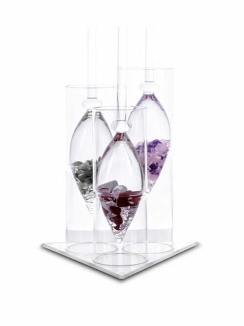 Là où l’eau pure a le goût d’une eau de source et est présentée dans un beau récipient avec une fiole remplie de pierres précieuses qui semblent flotter librement dans son centre.