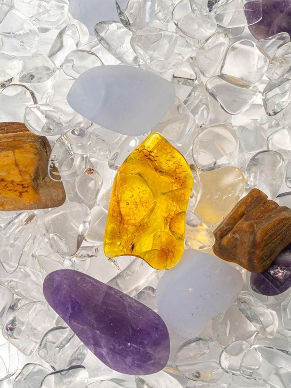 Ambre - Améthyste - Calcédoine - Bois pétrifié - Quartz clair